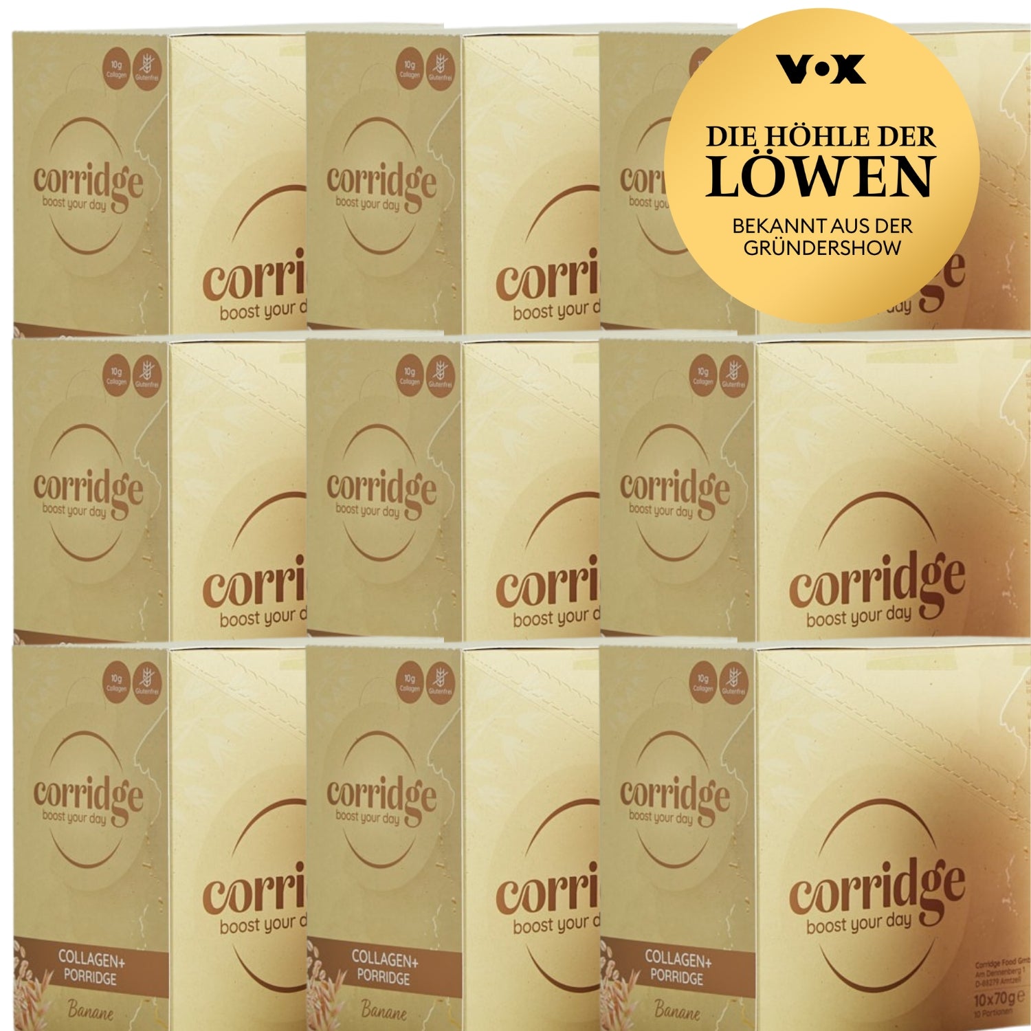 Corridge Banane – das High Protein Porridge mit Collagen. Dein funktionales Frühstück mit allen essentiellen Aminosäuren und einer Tagesportion Collagen (10g) für den perfekten Start in den Tag! Eine Box enthält 10 Stück praktische Tagesportionsbeutel (je 70g) - diese gewährleisten Frische, ein perfektes Mischungsverhältnis und lassen sich einfach und überall hin mitnehmen!